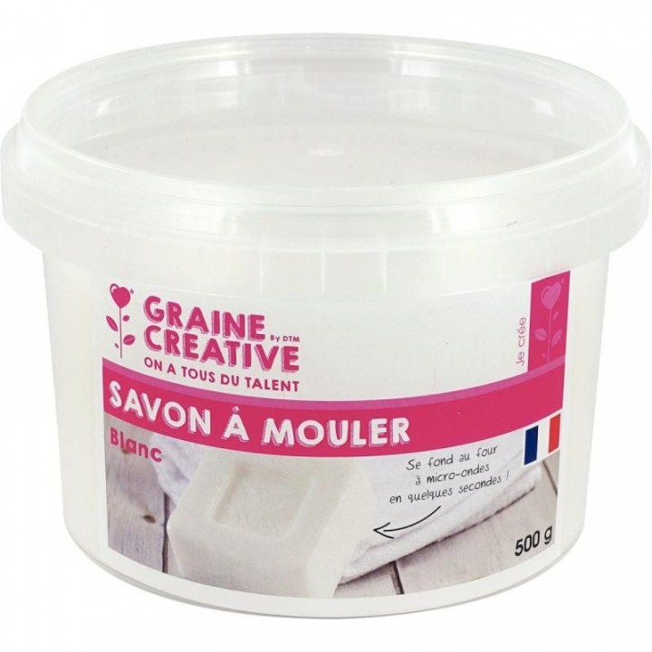 Pot de 500 grammes de savon à mouler blanc opaque. Hypoallergénique, ce savon fond au four à micro-ondes. Pour 10 savons de 50g.