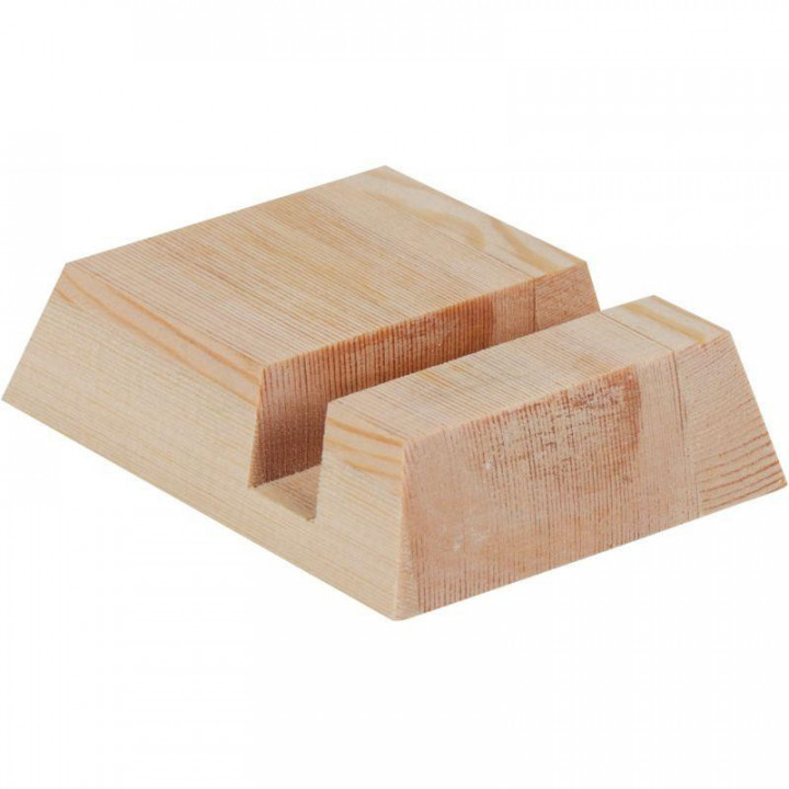 Support en bois pour téléphone portable. Support en bois naturel pour accueillir presque tous les modèles de téléphone portable. Très pratique sur le bureau pour avoir son téléphone à portée de main. Dimensions: L. 9,5 x l. 8 x épaisseur 3 cm.