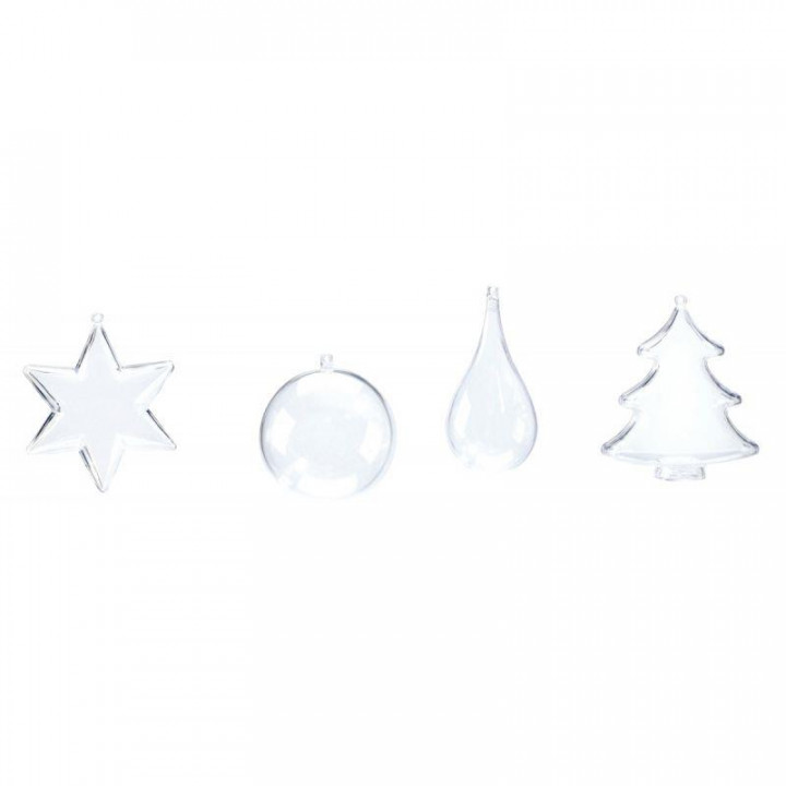 Lot de 24 objets de Noël en plastique, modèles assortis. Contenu : 6 boules Ø.8 cm, 6 sapins H.10 cm, 6 gouttes H.11 cm, 6 étoiles Ø.11 cm. Chaque forme est en 2 parties pour décorer à l'intérieur et à l'extérieur. Prêts à suspendre grâce à leurs anneaux de suspension.