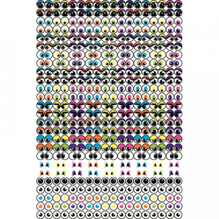 Pochette de 594 gommettes yeux adhésives assorties, repositionnables. 2 planches.