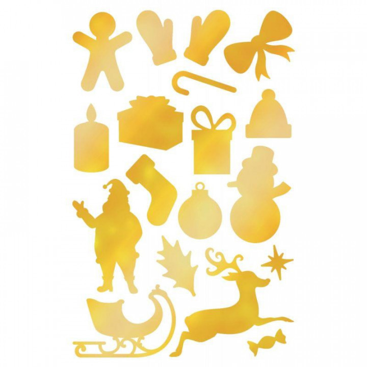 Blister d'environ 590 gommettes de Noël or et argent. 20 planches : 10 or et 10 argent. Motifs : étoiles, formes de Noël et flocons de neige. 2 motifs x 6 planches et 1 motif x 8 planches. Dimensions planche : 10,5 x 16 cm.