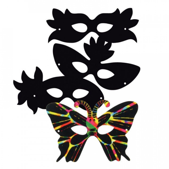 Lot de 12 masques en carte à gratter. Multicolore, 4 modèles. Dimensions d'environ : 22 x 15 cm.