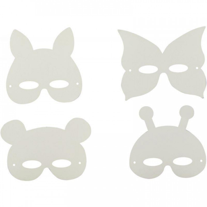 Lot de 24 masques en carton forme animaux assortis. En carton blanc. Fourni avec des élastiques. 4 modèles différents. A décorer avec des feutres, des feuilles decopatch/washi, des plumes, des paillettes, des perles, des pompons, de la laine etc ....
