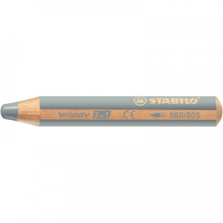 Crayon de couleur Woody argent. Crayon 3 en 1 à la fois crayon de couleur, craie grasse et aquarelle. Son corps large et léger est parfaitement adapté aux petites mains. Sa mine grasse extra tendre et très pigmentée permet de dessiner et écrire sur une multitude de surfaces, telles que le bois, le verre, le plastique, le carton ou encore une ardoise, un tableau noir ou blanc. Sa mine aquarellable se dilue avec un pinceau et de l’eau. Longueur 11cm, diamètre mine 10mm, diamètre crayon 15 mm. Corps rond.