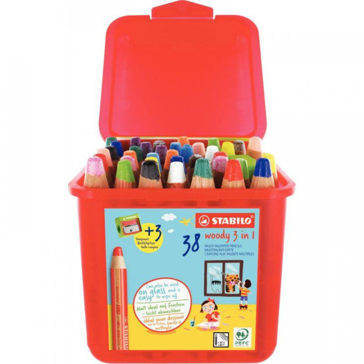 Classpack de 38 crayons de couleur Woody + 3 tailles-crayons. Crayon 3 en 1 à la fois crayon de couleur, craie grasse et aquarelle. Son corps large et léger est parfaitement adapté aux petites mains. Sa mine grasse extra tendre et très pigmentée permet de dessiner et écrire sur une multitude de surfaces, telles que le bois, le verre, le plastique, le carton ou encore une ardoise, un tableau noir ou blanc. Sa mine aquarellable se dilue avec un pinceau et de l’eau. Longueur 11cm, diamètre mine 10mm, diamètre crayon 15 mm. Corps rond.