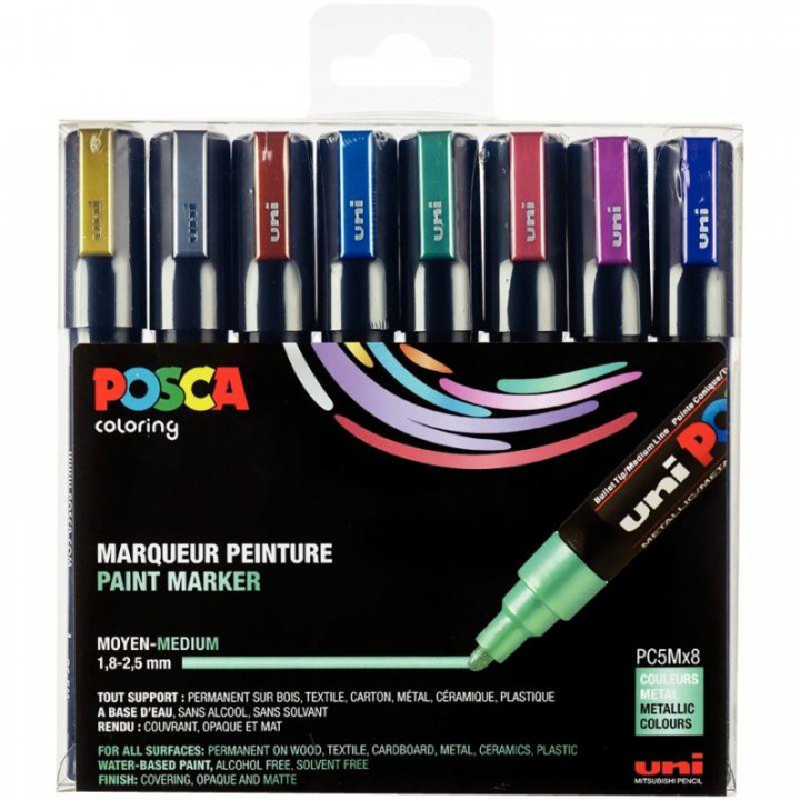Pochette de 8 marqueurs Posca pointe moyenne métal assortis. Largeur du trait: 1.8 à 2.5mm.
