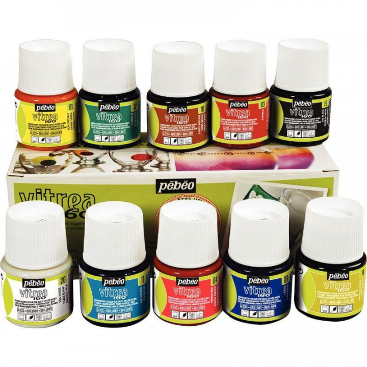 Boite de 10 flacons 45ml de peinture VITREA 160. Peinture à l’eau, brillante et translucide pour décorer le verre, le cristal, la porcelaine, la faïence et la céramique. 10 couleurs assorties : jaune soleil, paprika, rouge piment, bleu lazuli, turquoise, vert émeraude, vert santal, terre brûlée, noir d’encre et voile blanc. Couleurs prêtes à l’emploi et miscibles entre elles. Mode d’emploi : avant d'appliquer la peinture, nettoyer le support à l'eau savonneuse. Après 24 heures de séchage minimum, mettre l'objet décoré dans le four froid. Une fois la température de 160°C atteinte, cuire 40 minutes. A la fin de la cuisson, ouvrir le four et laisser refroidir l’objet à l’intérieur afin d’éviter tout choc thermique. Seules les surfaces non destinées à être mises en contact avec les aliments doivent être décorées. Après cuisson, les couleurs résistent au lave-vaisselle. Excellente tenue à la lumière. Nettoyage des outils à l'eau savonneuse.