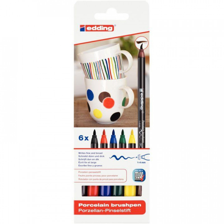 Pochette de 6 feutres porcelaine couleurs primaires. Couleurs primaires : Noir, rouge, bleu, vert, jaune et marron. Feutre de coloriage résistant au lave-vaisselle pour peindre de grandes surfaces et des détails sans goutter ni s'étaler sur la porcelaine, la céramique émaillée et le verre thermorésistant. La pointe pinceau flexible a une largeur de trait de 1 à 4 mm. L'encre pigmentée à base d'eau sèche rapidement, elle peut être corrigée avant la cuisson au four et est particulièrement résistante à la lumière. Après la fixation à la chaleur, les créations sur porcelaine résistent au lave-vaisselle jusqu'à 50 °C.
