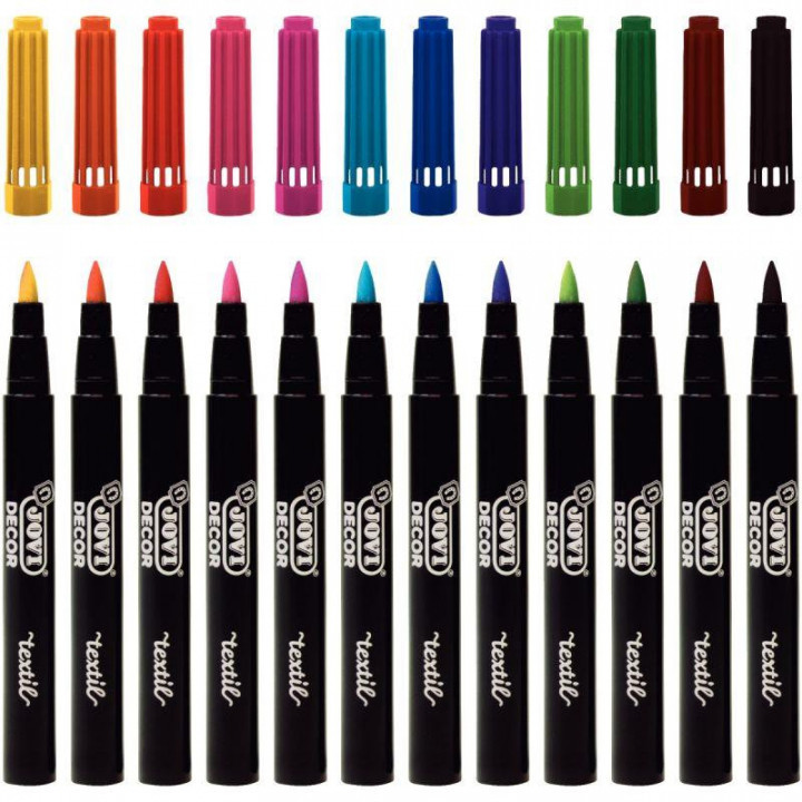 Pochette de 12 feutres textile. Feutre pour tissu à encre permanente. Encre à base d'eau. Capuchon ventilé et bouchon de sécurité. Résiste aux lavages jusqu’à 40º en cycle normal. Pointe du feutre ø 4,8 mm permettant un tracé fin ou épais. Pour fixer la couleur, passer le fer chaud sur le dessin.