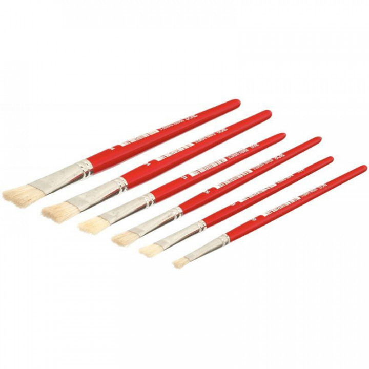 Pot de 144 brosses plates en soie de porc 24 piècesx6 tailles assorties (n° 6, 8, 10, 12, 14 et 16). Manche en bois verni et virole en aluminium anodisé anti rouille. La soie de porc est dotée d'une grande élasticité et résiste particulièrement bien à l'usure. Idéal pour l'huile et l'acrylique. Permet les travaux d'empâtement et de matières.Convient parfaitement au milieu scolaire