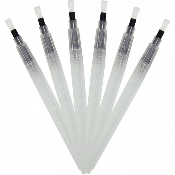 Lot de 6 brosses plates à réservoir, pointes moyennes. Pointe plate 6 mm de large, 2 mm d'épaisseur. Idéal pour les aplats et pour l’aquarelle. Pinceau brosse à réservoir rechargeable de 8 ml à dévisser. Remplir d'eau, d'encre ou de peinture fluide et appuyer sur le réservoir pour contrôler le débit. Avec capuchon et poils en fibre synthétique. Nettoyage facile.