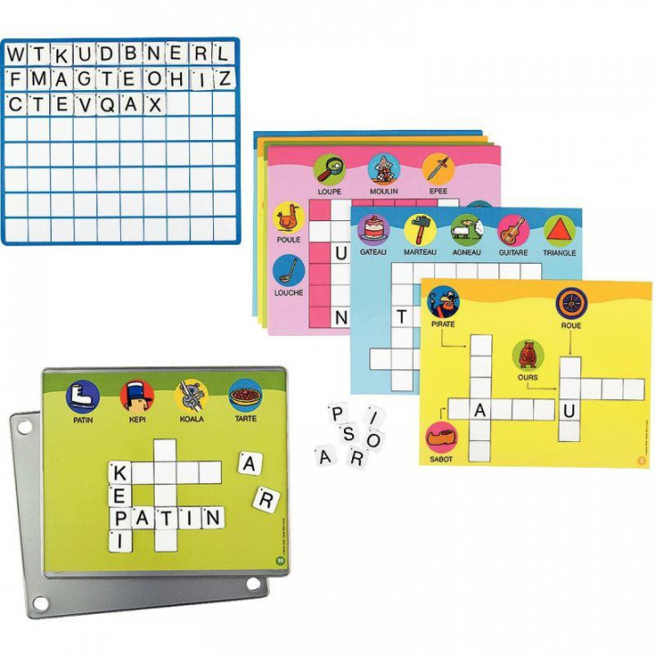 Atelier mots croisés. Cet atelier d’entraînement a pour objectif de familiariser les enfants avec l’écrit et de leur faire découvrir le principe alphabétique, de manière à pouvoir aborder avec plus d’aisance l’apprentissage de la lecture. Les enfants remplissent les grilles de mots croisés avec les lettres magnétiques en s’aidant des mots illustrés et des lettres indices, comme dans une situation problème. Ils s’entraînent à dénombrer les lettres dans un mot, à comparer la longueur des mots, à repérer la place d’une lettre dans un mot, à repérer des lettres identiques. La boîte contient : 24 fiches d’activités réparties en 4 séries de 6 fiches (25 x 20 cm). 104 lettres capitales d’imprimerie en carton magnétique (côté : 2,3 cm). 2 supports métalliques (25,5 x 20,5 cm). 1 planche en carton magnétique (25 x 22 cm). 1 livret pédagogique. Dès 5 ans.