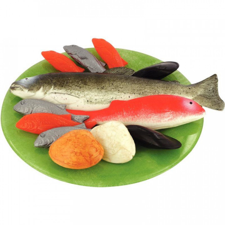 Sachet de 12 poissons en plastique. 1 truite, 2 moules, 2 coquillages, 6 sardines, 1 rouget. Dimensions: Ø coquillage 6 cm et L. de la truite 27 cm. Dès 2 ans.