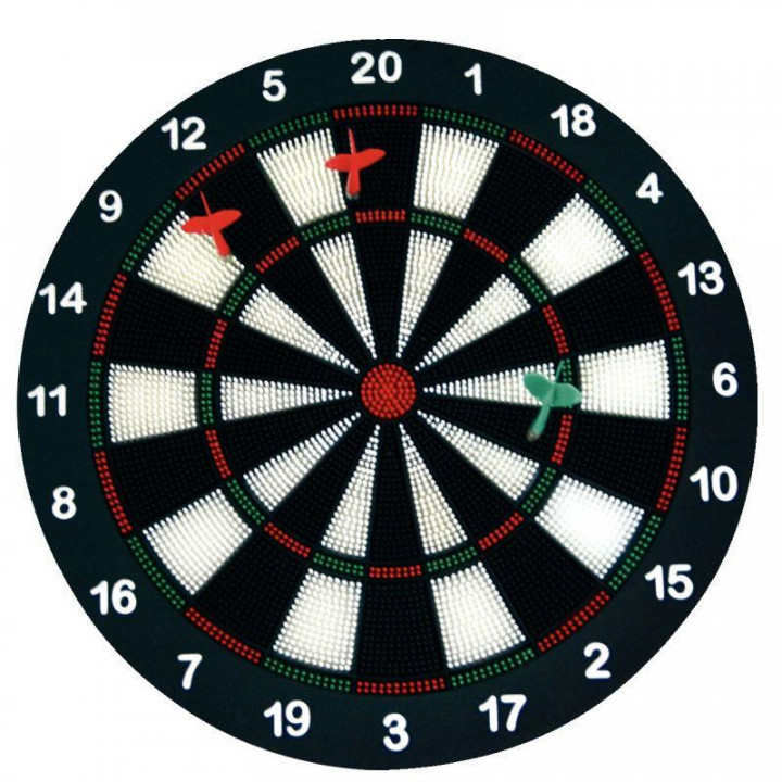 Cible de jeu diamètre 40cm avec 6 fléchettes en PVC. Un véritable jeu de fléchette sans danger ! Composé d'une cible couverte de petits embouts souples dans lesquels viennent se loger des fléchettes spéciales avec embout souple et arrondi. Idéal pour l'initiation et la pratique de ce sport.