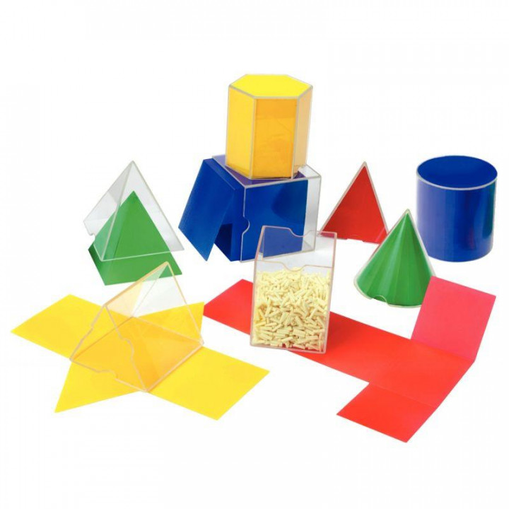 Boite de 8 figures géométriques volumes. Contenu de la boîte : cube, cylindre, cône, pyramide à base carrée, pyramide à base triangulaire, prisme à base hexagonale, rectangulaire et triangulaire. L'enfant à l'aide de la gaine transparente servant à contenir la forme pliée permet de la présenter dans sa forme tridimensionnelle. Exercice : calcul du volume, symétrie, périmètre, aire et volume. Manuel explicatif joint à la boîte. A partir de 7 ans.