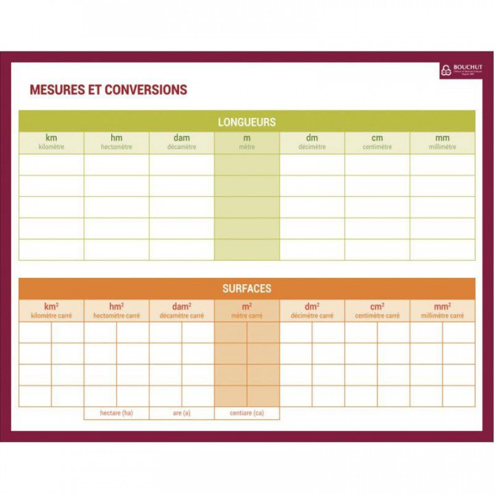 Ardoise effaçable à sec mesures et conversions. Ardoise effaçable à sec, recto : longueurs et surfaces, Verso : capacités, masses et volumes. Dimensions : 21x26.5cm PEFC.