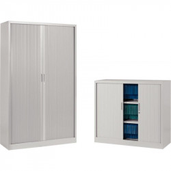 Armoire à rideaux monobloc haute H198cm corps alu/rideaux blanc. Equipée de 4 tablettes + 1 jeu de rails sous le plateau supérieur, pour 5 niveaux de dossiers suspendus entraxe 33cm (possibilité 6 niveaux avec tablette supplémentaire). Vérins de réglage de niveau. 2 clés de sécurité. Structure rigide monobloc soudée. Tablettes finition noire ou blanche (armoires corps blanc). Dim: L120xP45cm. Garantie 5 ans.
