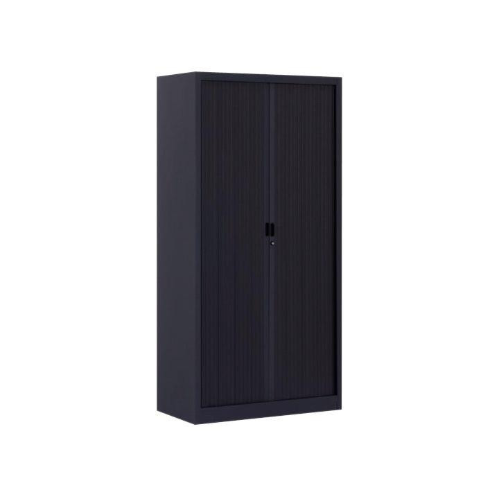 Armoire monobloc anthracite 180x90x43cm 2 rideaux 3 tablettes. Fabrication monobloc en tôle d'acier, peinture époxy résistante aux chocs et aux rayures. Double rideau vertical en lamelles PVC s'escamotant totalement dans les parois latérales de l'armoire. Poignées encastrées. Serrure à clés. Equipée de 3 tablettes noires réglables tous les 3 cm avec replis pour dossiers suspendus. Hauteur 180 x Largeur 90 x Profondeur 43 cm. Emballé avec coiffes sous film rétractable. Garantie 5 ans.