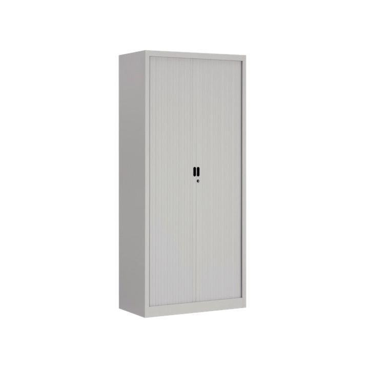 Armoire monobloc gris 180x90x43cm 2 rideaux 3 tablettes. Fabrication monobloc en tôle d'acier, peinture époxy résistante aux chocs et aux rayures. Double rideau vertical en lamelles PVC s'escamotant totalement dans les parois latérales de l'armoire. Poignées encastrées. Serrure à clés. Equipée de 3 tablettes noires réglables tous les 3 cm avecr eplis pour dossiers suspendus. Hauteur 180 x Largeur 90 x Profondeur 43 cm. Emballé avec coiffes sous film rétractable. Garantie 5 ans.