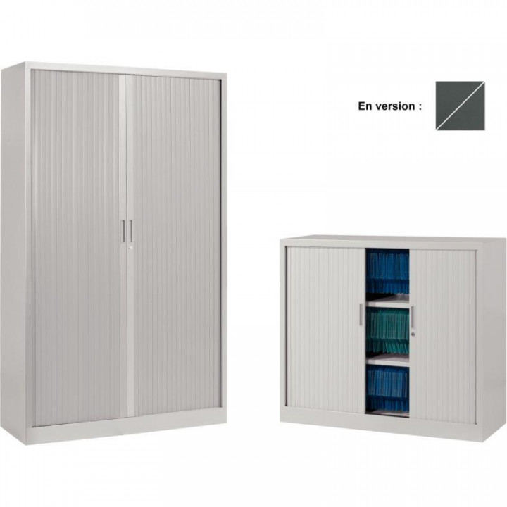Armoire à rideaux monobloc basse H105cm corps anthracite/rideaux anthracite. Equipée de 2 tablettes + 1 jeu de rails sous le plateau supérieur, pour 3 niveaux de dossiers suspendus. Vérins de réglage de niveau. 2 clés de sécurité. Structure rigide monobloc soudée. Tablettes finition noire ou blanche (armoires corps blanc). Dim: L120xP45cm. Garantie 5 ans.