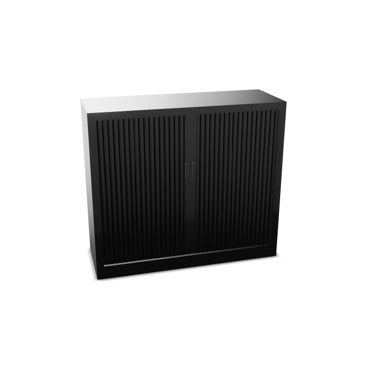 Armoire à rideaux monobloc basse H105cm corps noir/rideaux noir. Equipée de 2 tablettes + 1 jeu de rails sous le plateau supérieur, pour 3 niveaux de dossiers suspendus. Vérins de réglage de niveau. 2 clés de sécurité. Structure rigide monobloc soudée. Tablettes finition noire ou blanche (armoires corps blanc). Dim: L120xP45cm. Garantie 5 ans.