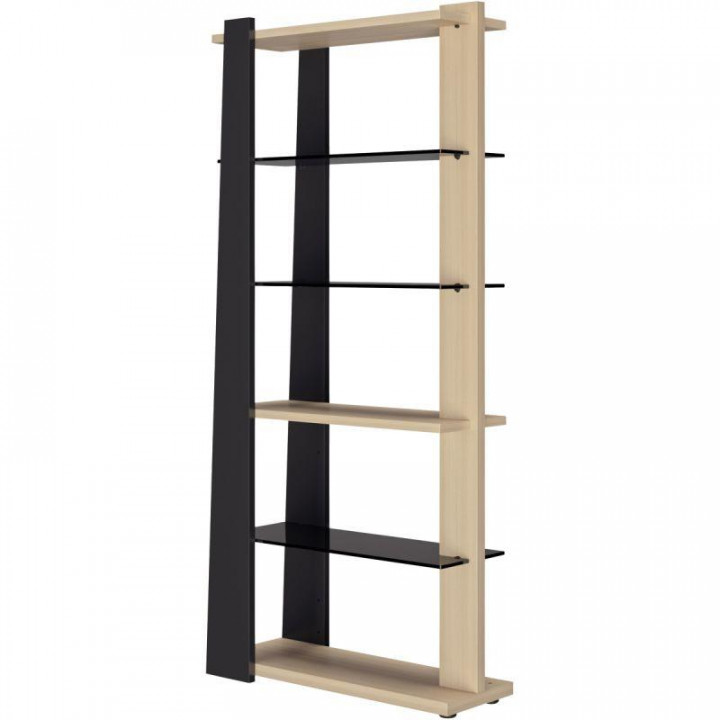 Bibliothèque E-Motion chêne structuré. Structure : Panneaux de particules revêtus mélamine. Plateaux et façades épaisseur 18mm. Chants même finition dont certains épais. 3 tablettes verre, 1 tablette bois. Possibilité de placer verticalement 1 option éclairage 1 barre de Leds. Tablettes verre : trempé teinté noir épaisseur 10mm. Garantie 5 ans.