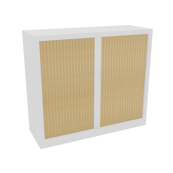 Armoire à rideaux monobloc basse H105cm corps blanc/rideaux chêne naturel. Equipée de 2 tablettes + 1 jeu de rails sous le plateau supérieur, pour 3 niveaux de dossiers suspendus. Vérins de réglage de niveau. 2 clés de sécurité. Structure rigide monobloc soudée. Dim: L120xP43cm. Garantie 5 ans.