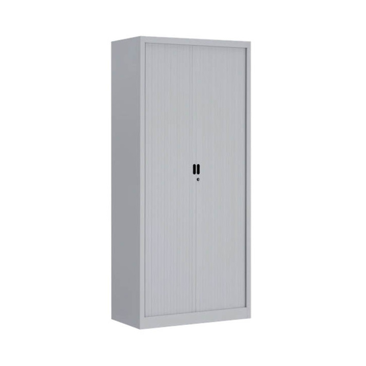 Armoire monobloc gris 180x90x43cm 2 rideaux 3 tablettes. Fabrication monobloc en tôle d'acier, peinture époxy résistante aux chocs et aux rayures. Double rideau vertical en lamelles PVC s'escamotant totalement dans les parois latérales de l'armoire. Poignées encastrées. Serrure à clés. Equipée de 3 tablettes noires réglables tous les 3 cm avecr eplis pour dossiers suspendus. Hauteur 180 x Largeur 90 x Profondeur 43 cm. Emballé avec coiffes sous film rétractable. Garantie 5 ans.