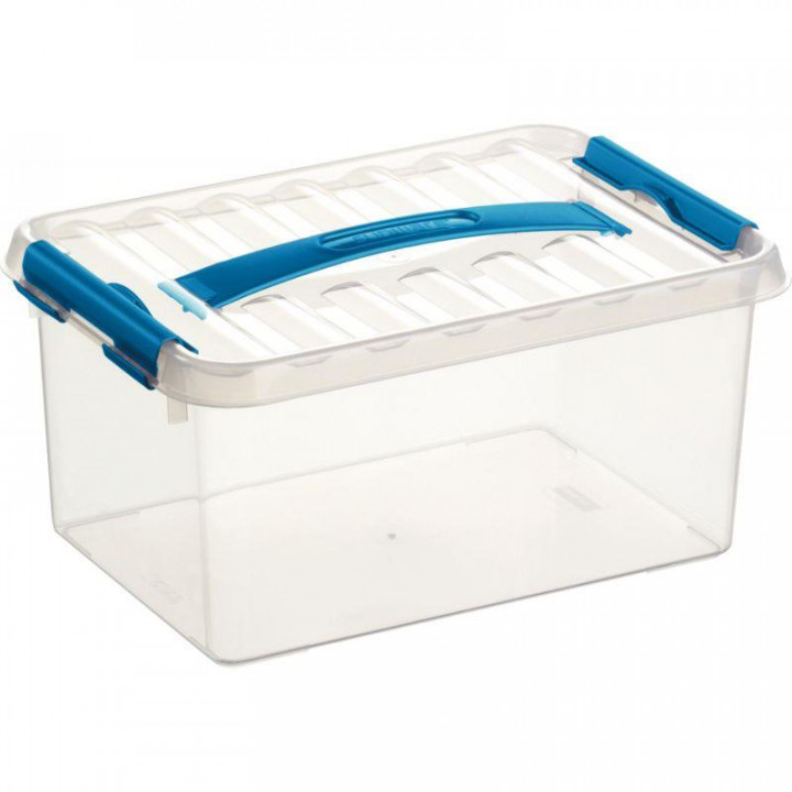 Boite de rangement QLINE 6L transparente. Boîte de rangement multifonction pour ranger divers produits à l'abri de l'humidité et de la poussière. Pratique, facile à empiler et équipée de clips bleus de fermeture solides pour que le couvercle reste bien en place. Transparente, vous pouvez voir ce qu'elle contient d'un seul coup d'œil.