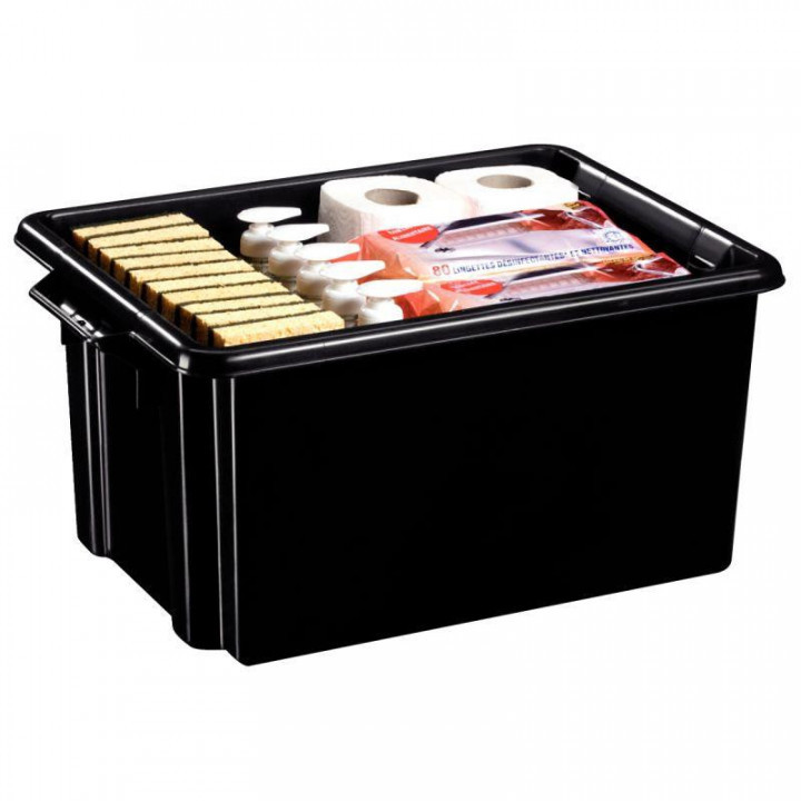 Bac de rangement 32L noir. Parois pleines avec renforcement sur 2 faces du bacFond caissonnéLarge rebord sur le pourtour avec un bourrelet de rigidification2 poignées arrondies renforcées Système de creux et de bossages intérieursDimensions utiles : 374 x 294 x H 234 mmDimensions hors tout : 524 x 350 x H 241 mm Forme conique permettant le gerbage (encastrement)