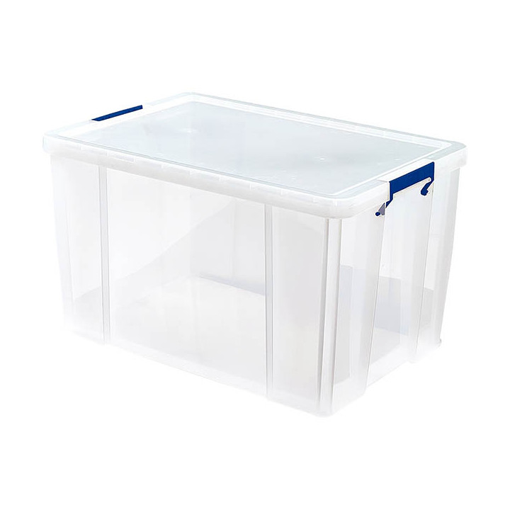 Boite de rangement 85L transparente. Construites pour durer, ces boîtes solides en plastique sont fabriquées en polypropylène résistant aux chocs. Suffisamment solides pour être empilées grâce à sa double base renforcée