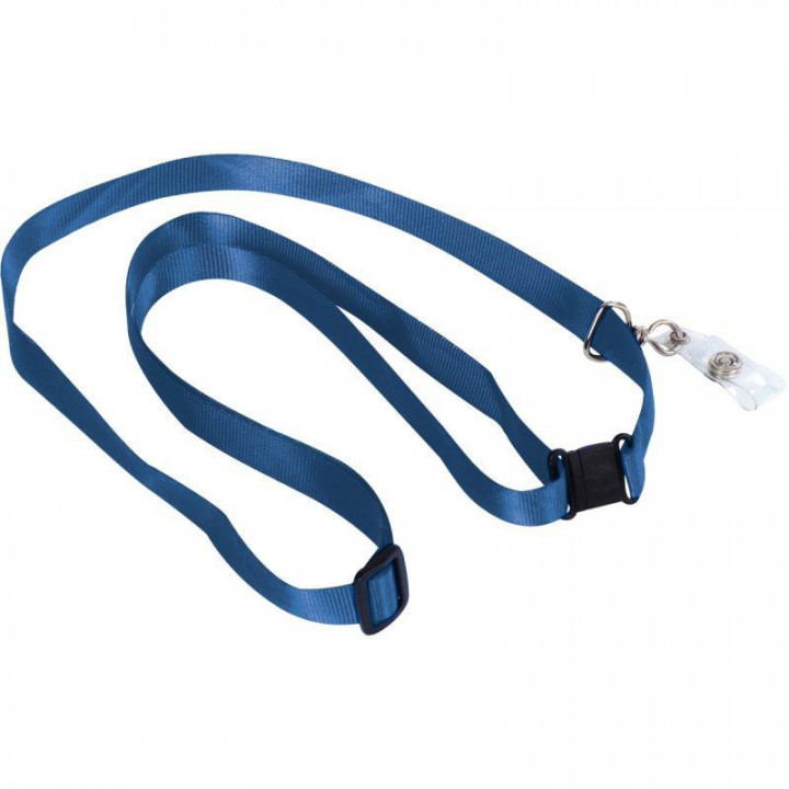 Boîte de 10 lacets textile ajustables bleu. Longueur ajustable environ 30cm (pour badge événementiel A6), jusqu'à 50cm (porte-carte de sécurité). 1 crochet métal. Clip de sécurité pour ouverture en cas de tension excessive. Largeur env. 14mm.