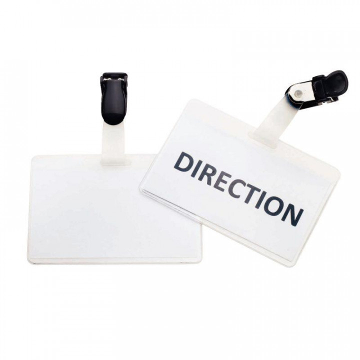 Boite de 50 badges pince + bretelle. PVC. Livrés avec bristol. Dim badges: 90 x 60 mm. Dim utiles: 88 x 48 mm.
