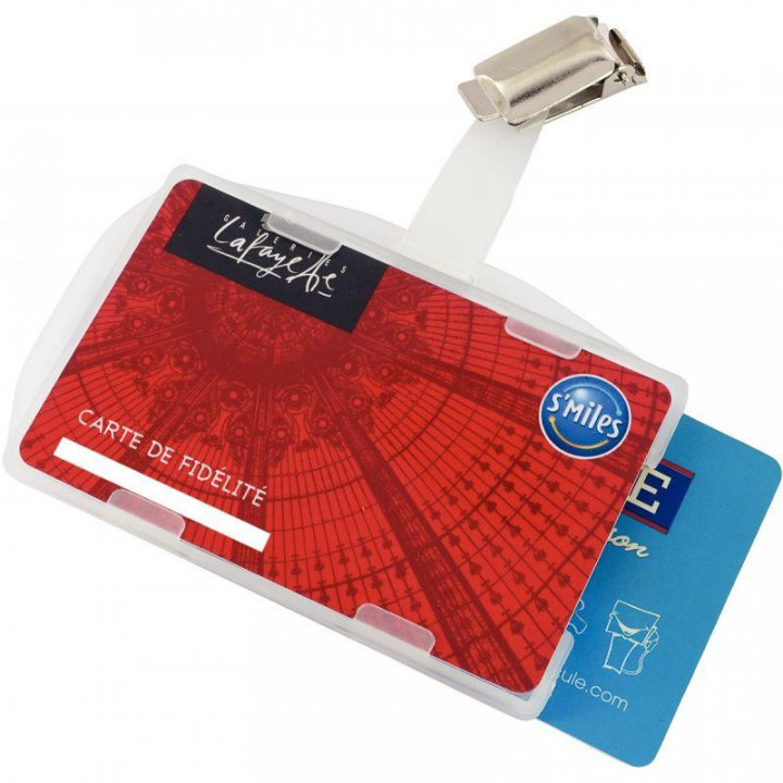 Boîte de 25 porte-carte de sécurité semi rigide ouvert. Livré avec pince + bretelle de fixation. Double face (1 à 2 cartes). Dim utiles: 85x54mm.