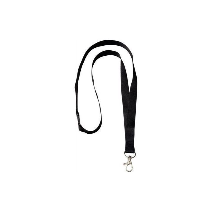 Boîte de 10 lacets textile recyclés noir. Largeur de 20mm. Longueur 44cm. Mousqueton standard. Fabriqué à partir de polyester recyclé pour badge avec perforation centrale. Clip de sécurité en cas de traction excessive.