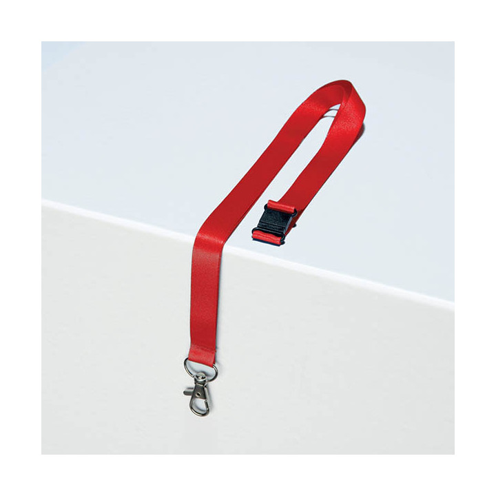Boîte de 10 lacets textile recyclés rouge. Largeur de 15mm. Longueur 44cm. Mousqueton standard. Fabriqué à partir de polyester recyclé pour badge avec perforation centrale. Clip de sécurité en cas de traction excessive.