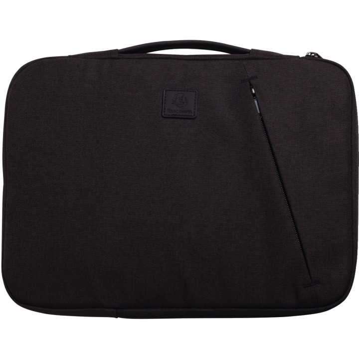 Housse informatique business 15 pouces noire. Fine et légère avec ouverture zippée sur 2 côtés seulement pour éviter que le PC tombe. Finitions soignées avec rembourrage. Mini poche zippée a l'avant. Fabriquée à partir du recyclage de bouteilles en plastiques. Format 41 x 31 x 2.5cm
