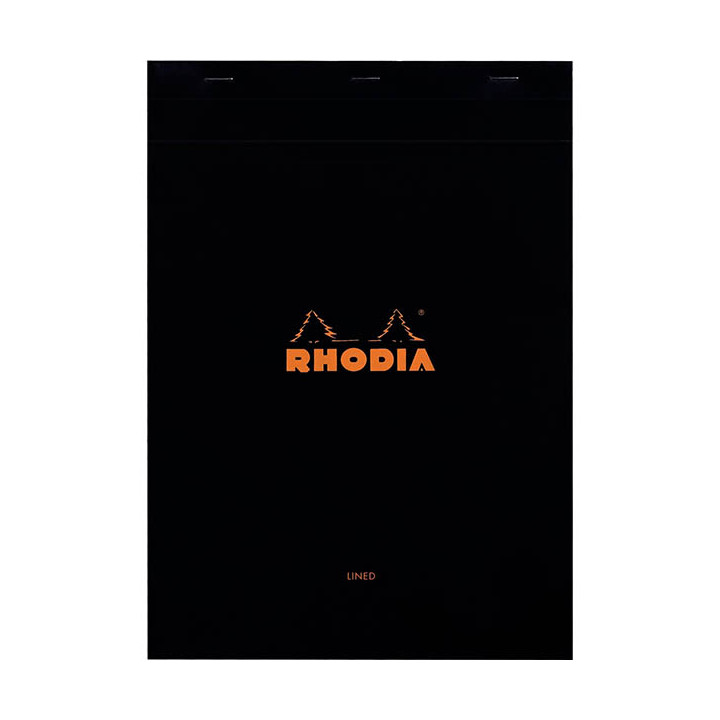 Bloc de bureau RHODIA BLACK 80 feuilles, format A4, ligné, papier blanc 80g. Bloc agrafé format 21x29,7 cm. Feuilles micro-perforées détachables, NON perforées. Papier vélin supérieur blanc pour un grand confort d'écriture. Couverture noire enveloppante enduite et rabattable. Ligné 7 mm + marge.