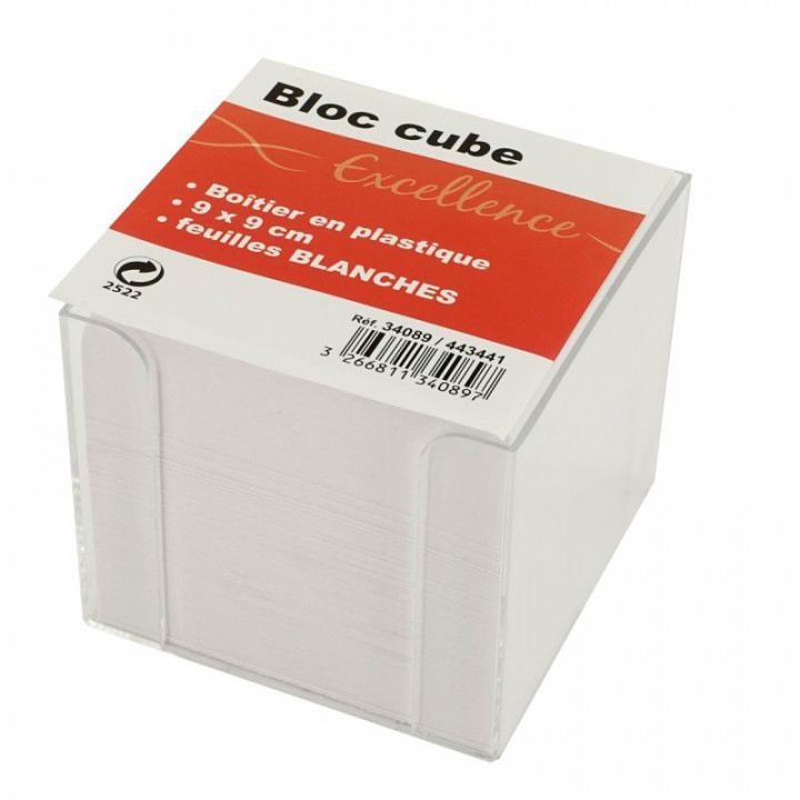 Boîtier en plastique transparent garni d'un bloc de 700 feuilles blanches, dimensions : 9 x 9 x 9 cm.