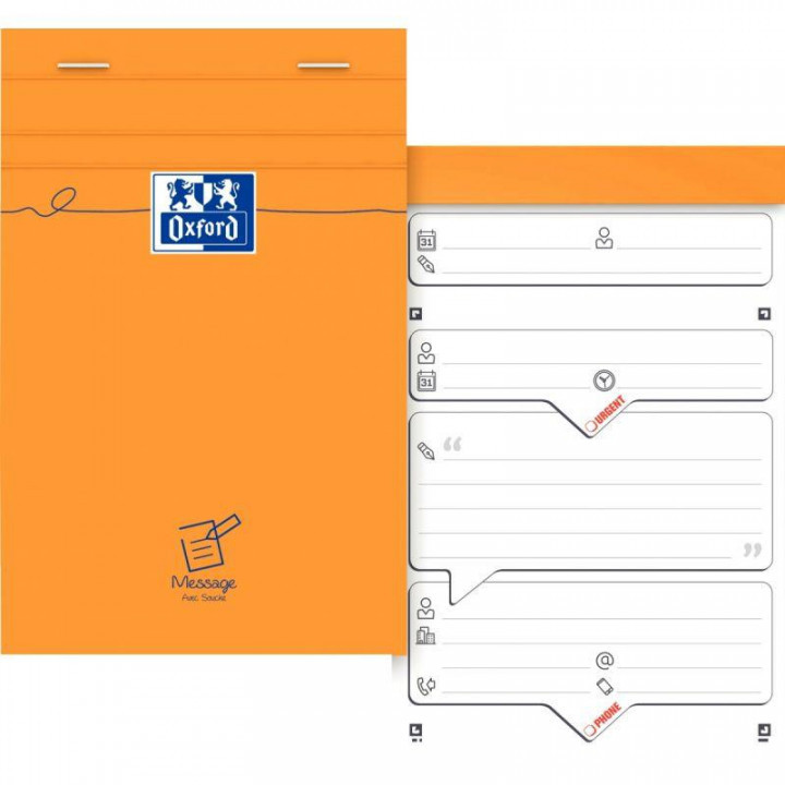 Bloc messages téléphoniques OXFORD 80 feuilles, format 11x17 cm. 160 pages micro-perforées détachables, papier extra blanc Optik Paper+® 80g / 90g. Avec une souche pour garder la trace du message. Réglure 2 couleurs. Couverture carte enduite orange ultra résistante. Fonction SCRIBZEE : l'application qui scanne et sauvegarde les notes dans un cloud sécurisé.