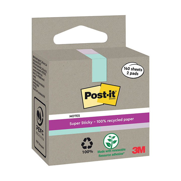 Boite de 2 blocs note recyclés de 140 feuilles Bleu et violet . 2 blocs par paquet de 70 feuilles bleu et 70 feuilles violet sur 76x76 mm= 140 feuilles 100% recyclés