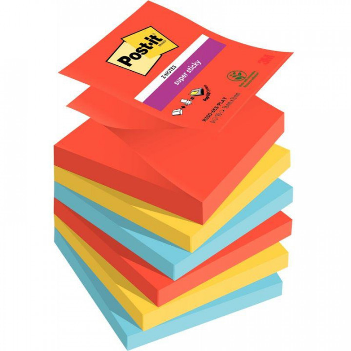 Lot de 6 blocs Z notes sticky post it 90 feuilles 76 x 76 mm collection playful. coloris assortis : Rouge pomme, jaune soleil, bleu paradis