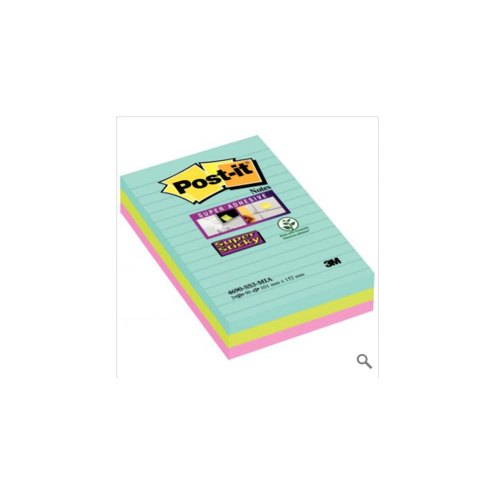 Paquet de 3 blocs Notes Super Sticky de 90 feuilles lignées, format 101 x 152 mm, Cosmic. 3 coloris : bleu océan, vert néon et rose néon.