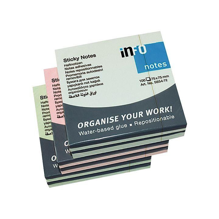 Paquet de 6 blocs repositionnables 75 x 75 mm pastel coloris assorti.