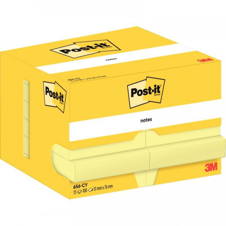 Lot de 12 blocs de 100 feuilles post-it notes 51 x 76 mm coloris jaune. Les classiques ! Un indispensable sur le bureau. Adhésif renforcé et repositionnable. Super collant, adhère mieux, plus longtemps et sur tous types de surfaces, mêmes verticales (murs, portes, ordinateurs, téléphones, pochettes plastiques...).