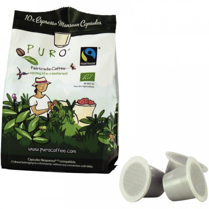 Sachet de 10 capsules café PURO doux. Monsoon : Délicat et complexe aux notes de fruits et d'agrumes.