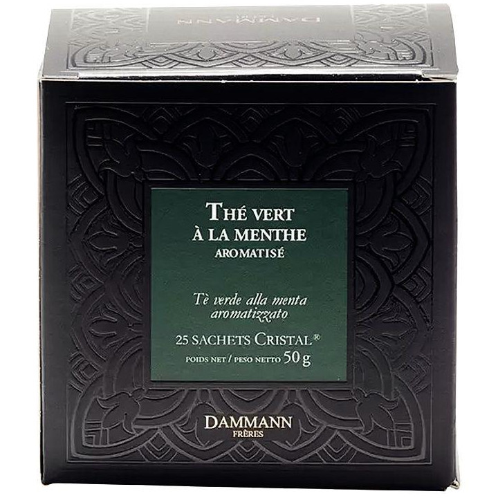 Boite de 25 sachets thé vert menthe DAMMANN . Thé vert à la menthe aromatisé est inspiré de l’incontournable thé à la menthe marocain. Communion entre la délicate menthe douce et la subtile fraîcheur de la menthe poivrée, toutes deux portées par le thé, vous offrira une infusion puissante et rafraîchissante.