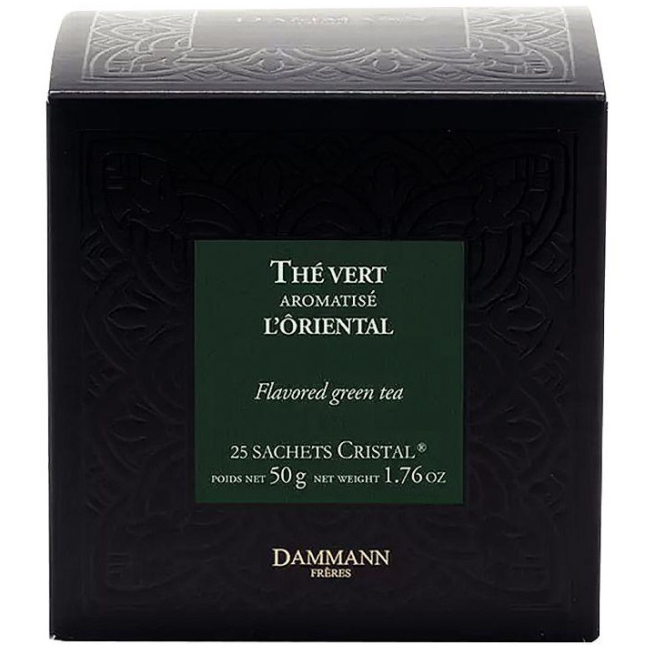 Boite de 25 sachets thé vert oriental DAMMANN . Richesse de senteurs dans ce mélange de thé vert mêlé aux arômes fruit de la passion, pêche de vigne et fraise des bois. Offre une dégustation aux nuances fraîches et veloutées.