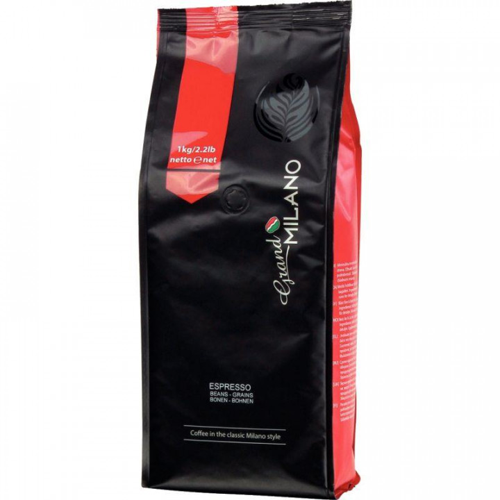 Paquet de 1kg café grain GRAND MILANO . 95% Arabica 5% Robusta. A conserver dans un endroit sec et frais.