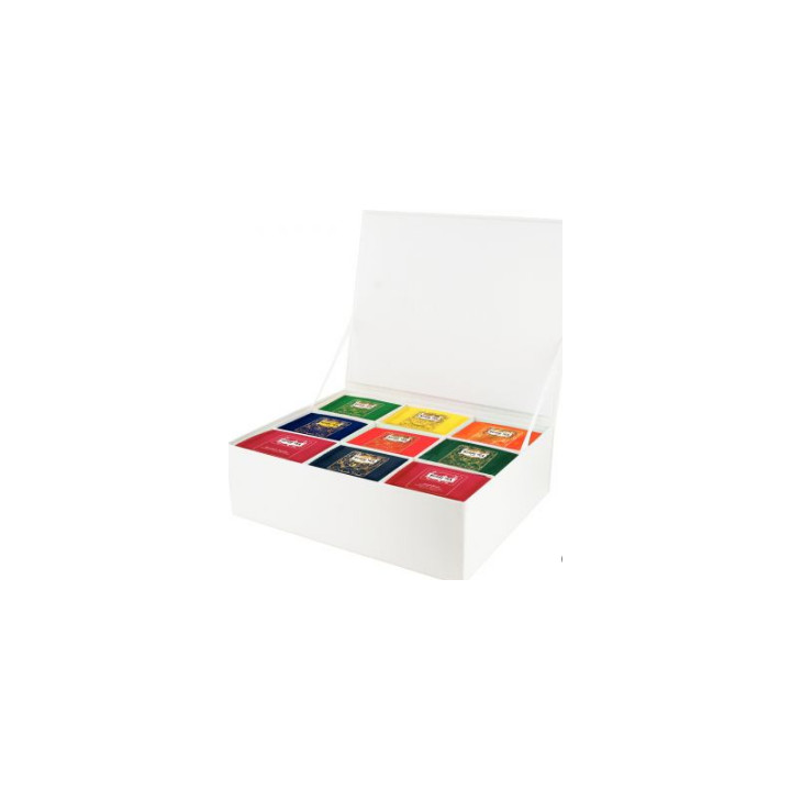 Coffret 100 sachet thé sélection Kusmi Tea. Composition de la boite : Anastasia : Thé noir* (99%), huiles essentielles de bergamote, de citron, de citron vert, arôme naturel de fleur d'oranger AquaRosa : Hibiscus* (38%), pomme*, raisin*, fruits rouges* (cassis, fraise, framboise, myrtille, sureau) (10%), feuilles de mûrier*, arômes naturels de fruits rouges (5%) Ceylan : Thé noir* de Ceylan Earl Grey : Thé noir*, huile essentielle de bergamote English Breakfast : Thé noir de Ceylan* , thé noir d'Assam* Rooibos Vanille : Rooibos* (95%), arôme naturel de vanille (5%) Thé Vert à la Menthe : Thé vert*, feuilles de menthe* (5%), arôme naturel de menthe Thé Vert au Jasmin : Thé vert* parfumé au jasmin Thé Vert de Chine : Thé vert* de Chine *Produits issus de l'agriculture biologique
